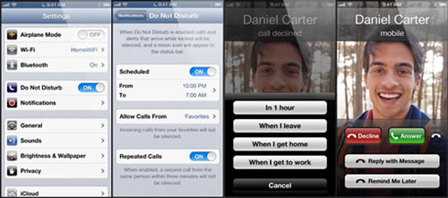 สำหรับในส่วนของโทรศัพท์มีการปรับปรุงเรื่องปุ่มกดรับสาย-วางสายใหม่ โดยมีการแทรกปุ่มไอคอนโทรศัพท์มาอีกอันทางมุมขวา โดยเมื่อเราปัดปุ่มดังกล่าวขึ้นมาจะมีปุ่มกด Reply with Mesage กับ Remind Me later เพิ่มเข้ามา