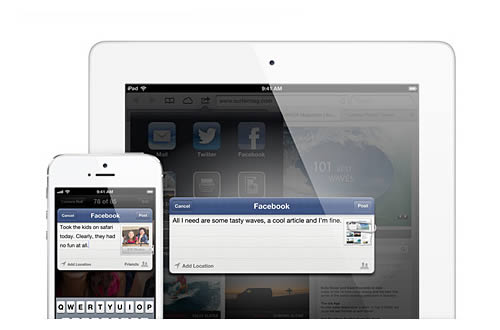 สำหรับการรวม Facebook มาไว้ใน iOS 6 จะเหมือน ๆ กับตอน iOS 5 รวมร่างกับ Twitter แต่ด้วยความที่ Facebook มีของเล่นเยอะกว่าเลยทำให้ทุกอย่างถูกผสมผสานกันเช่นเรื่องนัดหมายบน Facebook จะมาปรากฏบนปฏิทินในเครื่องเราด้วย วันเกิดเพื่อน ๆ ที่เราเห็นใน Facebook จะถูกนำมาซิงค์ข้อมูลกับสมุดโทรศัพท์ในเครื่องที่ใช้ iOS 6 ด้วย